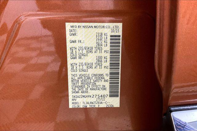 Certified. Pacific Sunset Metallic 2015 Nissan Murano SL FWD CVT with Xtronic 3.5L V6 DOHCHomer Skelton is committed to meeting your automotive needs with speed flexibility and friendly customer service. 21/28 City/Highway MPGCertification Program Details: ENGINE: All internally lubricated parts. Engine block head(s) and intake/exhaust manifolds if damaged as a result of the mechanical failure of an internally lubricated part. Fuel pump and water pump. Fluids seals/gaskets only when required with the replacement of a covered component(s)/part(s). TRANSMISSION/TRANSFER CASE: All internally lubricated parts. Gear cases and housings if damaged as the result of the mechanical failure of an internally lubricated part. Torque converter vacuum modulator valve. Fluids seals/gaskets only when required with the replacement of a covered component(s)/part(s). DRIVE AXLE: All internally lubricated parts. Gear cases and housings if damaged as the result of the mechanical failure of an internally lubricated part. Axle shafts and bearings C.V. and universal joints propeller shafts. Fluids seals/gaskets only when required with the replacement of a covered component(s)/parts(s). PLUS...24-HOUR EMERGENCY ROADSIDE SERVICE Provides towing assistance; dead battery service; flat tire assistance; fuel oil and water delivery service; and lockout service expenses up to $50 per occurrence for 12 months from the vehicle sale date.SL Technology Package (Intelligent Cruise Control Power Panoramic Moonroof and Predictive Forward Collision Warning (PFCW)) 11 Speakers 4-Wheel Disc Brakes 4.677 Axle Ratio ABS brakes Activation Disclaimer Air Conditioning Alloy wheels AM/FM radio Anti-whiplash front head restraints Auto-dimming Rear-View mirror Automatic temperature control Brake assist Bumpers: body-color CD player Compass Delay-off headlights Driver door bin Driver vanity mirror Dual front impact airbags Dual front side impact airbags Electronic Stability Control Floor Mats & Cargo Area Protector Four wheel independent suspension Front anti-roll bar Front Bucket Seats Front Center Armrest w/Storage Front dual zone A/C Front fog lights Front reading lights Fully automatic headlights Garage door transmitter: HomeLink Heated door mirrors Heated Front Bucket Seats Heated front seats Illuminated entry Illuminated Kick Plates Knee airbag Leather Appointed Seat Trim Leather Shift Knob Low tire pressure warning Memory seat Navigation System Occupant sensing airbag Outside temperature display Overhead airbag Overhead console Panic alarm Passenger door bin Passenger vanity mirror Power door mirrors Power driver seat Power Liftgate Power passenger seat Power steering Power windows Radio data system Radio: AM/FM/CD Audio System w/Navigation Rear anti-roll bar Rear reading lights Rear seat center armrest Rear window defroster Rear window wiper Remote keyless entry Roof rack: rails only Security system Speed control Speed-sensing steering Speed-Sensitive Wipers Splash Guards Split folding rear seat Spoiler Steering wheel mounted audio controls Tachometer Telescoping steering wheel Tilt steering wheel Traction control Trip computer Turn signal indicator mirrors Variably intermittent wipers and Wheels: 18"" Machined Aluminum-Alloy.