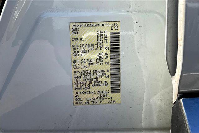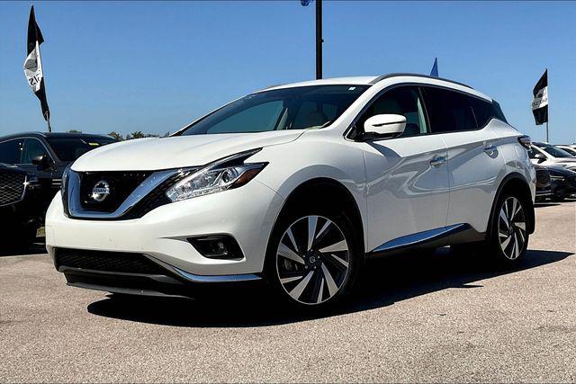 CARFAX One-Owner. Clean CARFAX. Pearl White 2017 Nissan Murano Platinum FWD CVT with Xtronic 3.5L V6Homer Skelton is committed to meeting your automotive needs with speed flexibility and friendly customer service. Odometer is 31093 miles below market average! 21/28 City/Highway MPG11 Speakers 4.677 Axle Ratio 4-Wheel Disc Brakes ABS brakes Air Conditioning Alloy wheels AM/FM radio: SiriusXM Anti-whiplash front head restraints Auto-dimming Rear-View mirror Automatic temperature control Blind Spot Warning Brake assist Bumpers: body-color Carpeted Floor Mats & Cargo Mat CD player Compass Delay-off headlights Driver door bin Driver vanity mirror Dual front impact airbags Dual front side impact airbags Electronic Stability Control Emergency communication system: NissanConnect Services Four wheel independent suspension Front anti-roll bar Front Bucket Seats Front Center Armrest w/Storage Front dual zone A/C Front fog lights Front reading lights Fully automatic headlights Garage door transmitter: HomeLink Heated & Cooled Front Bucket Seats Heated door mirrors Heated front seats Heated rear seats Heated steering wheel Illuminated entry Knee airbag Leather Shift Knob Leather-Appointed Seat Trim Low tire pressure warning Memory seat Navigation System NissanConnect Services Powered By SiriusXM Occupant sensing airbag Outside temperature display Overhead airbag Overhead console Panic alarm Passenger door bin Passenger vanity mirror Power door mirrors Power driver seat Power Liftgate Power passenger seat Power steering Power windows Radio data system Radio: AM/FM/CD Audio System w/Navigation Rear anti-roll bar Rear reading lights Rear seat center armrest Rear window defroster Rear window wiper Remote keyless entry Roof rack: rails only Security system Speed control Speed-sensing steering Speed-Sensitive Wipers Splash Guards Split folding rear seat Spoiler Steering wheel memory Steering wheel mounted audio controls Tachometer Telescoping steering wheel Tilt steering wheel Traction control Trip computer Turn signal indicator mirrors Variably intermittent wipers Ventilated front seats and Wheels: 20"" Machined Aluminum-Alloy.